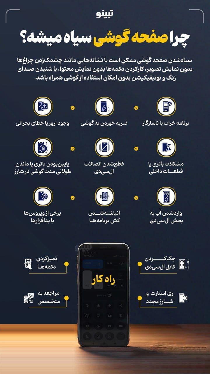 یکی از ترسناکترین صحنههایی که در گوشیهای هوشمند شاهدش هستیم زمانیست که میبینیم صفحه گوشی سیاه شده است. علت و رواش های حل مشکل را بخوانید./تبینو